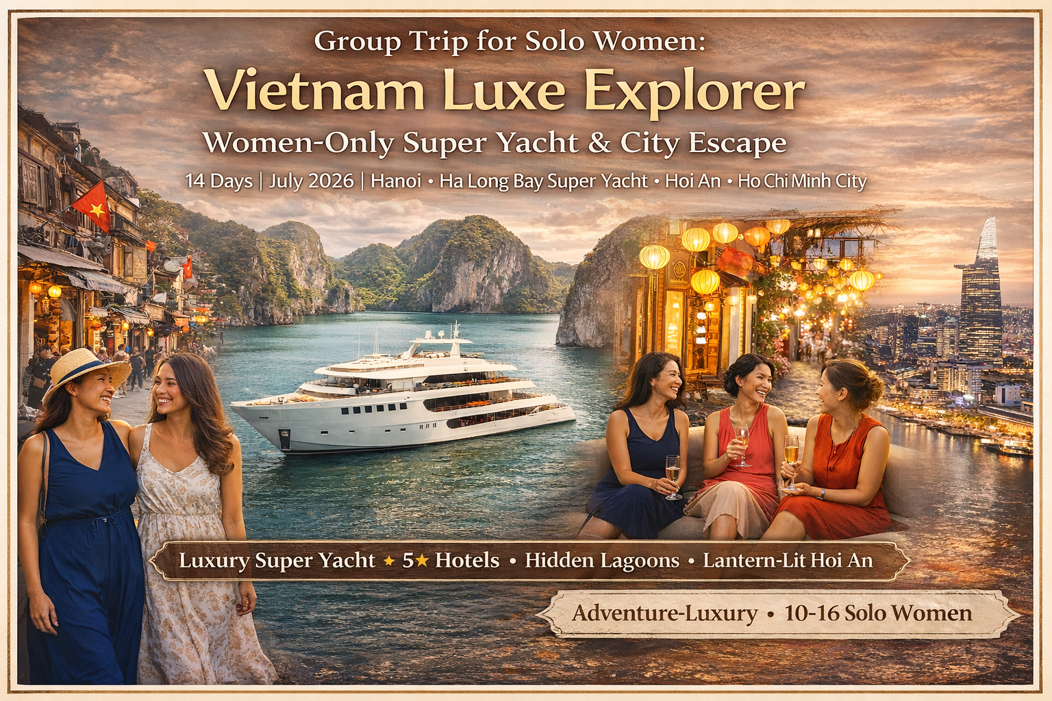 From the lantern‑lit charm of Hoi An to a 3‑night super yacht sailing among the limestone pinnacles of Ha Long Bay, plus the culinary and cultural energy of Hanoi and Ho Chi Minh City, this is adventure with elegance — crafted for women who want extraordinary moments and the ease of travelling with a like‑minded group, while still having room to breathe, relax and be yourself.