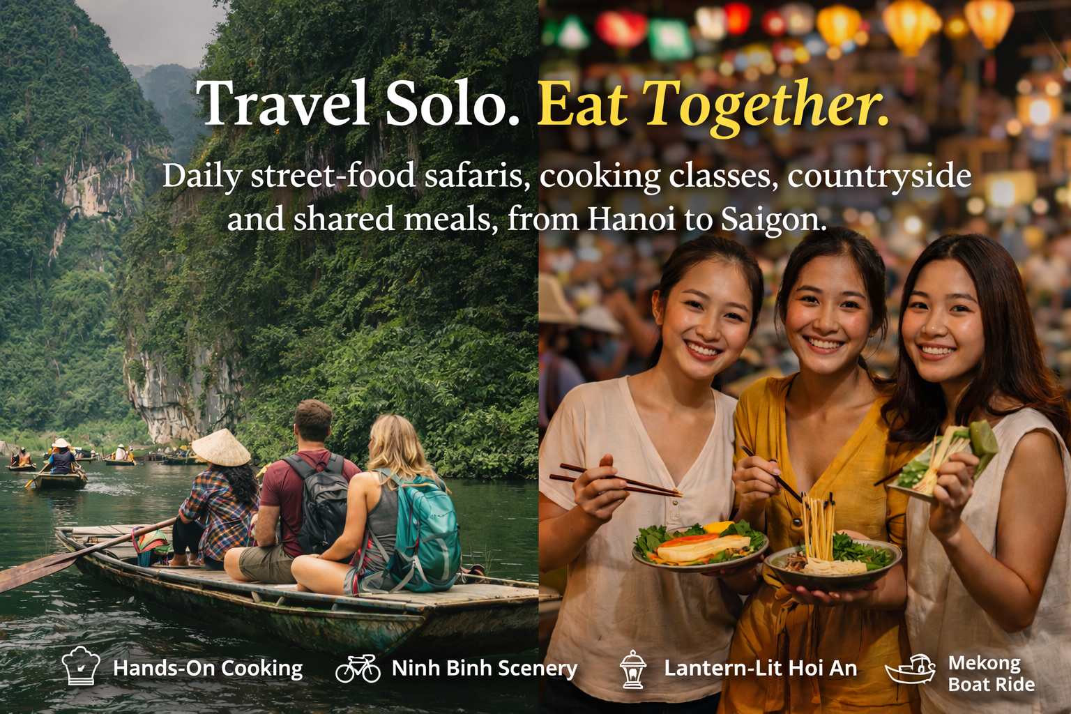 From steaming bowls of phở in Hanoi alleyways to lantern‑lit dinners in Hoi An and cacao farms in the Mekong Delta, this immersive 8‑day journey is designed for solo travellers who want to experience Vietnam through what it does best: food, people and everyday life.
