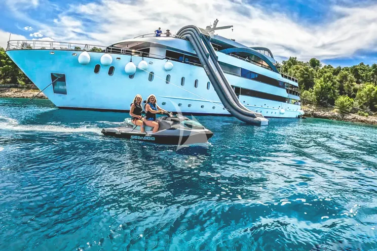A premium private super yacht experience with 15 cabins for up to 30 guests, professional crew, luxury deck spaces (including jacuzzis), wellness features like sauna/wellness room, cinema-style evenings, a swim platform, and a strong lineup of water toys (conditions permitting).